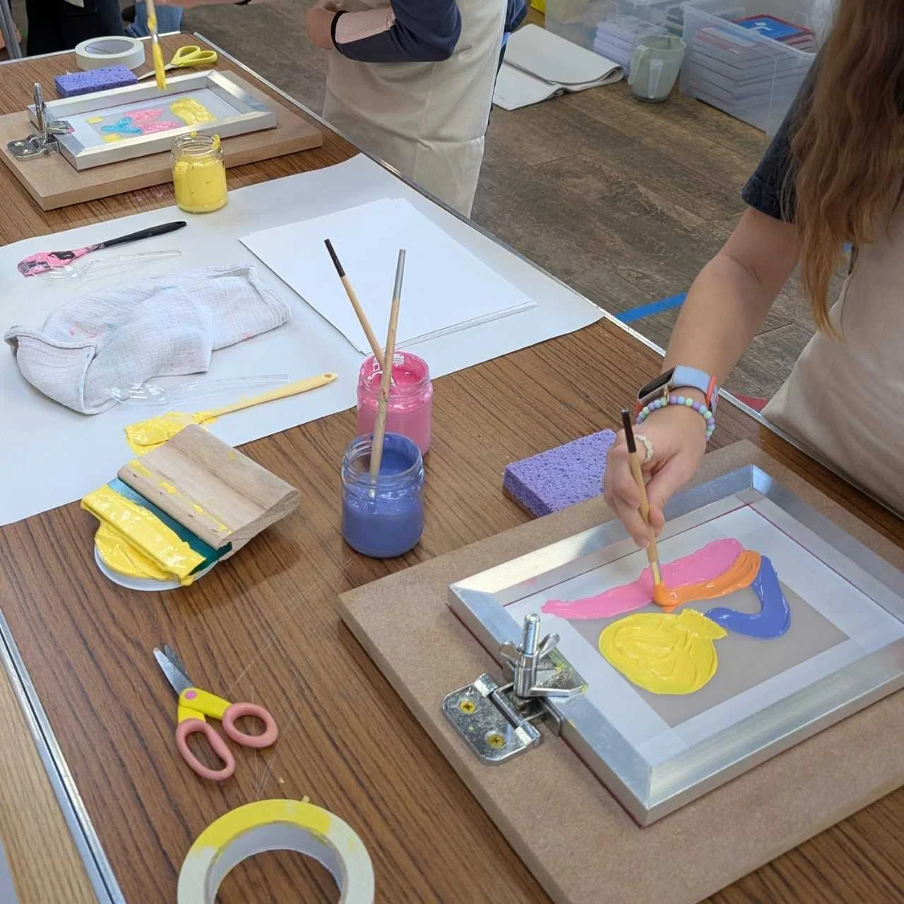 A Playful Introduction to Screen Printing with Laurie Hastings. Participants will create their own screen prints on paper, trying out the simple and playful techniques of colour layering, monoprinting and more! At the end of the session participants will leave with a good understanding of the screen printing process, and a set of experimental prints created with their own fair hands.